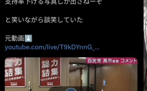 先日の記事高市総裁会見前「支持率下げてやる」発言問題についてで、発言したのは時事通信のカメラマンだったことが判明したそうです。